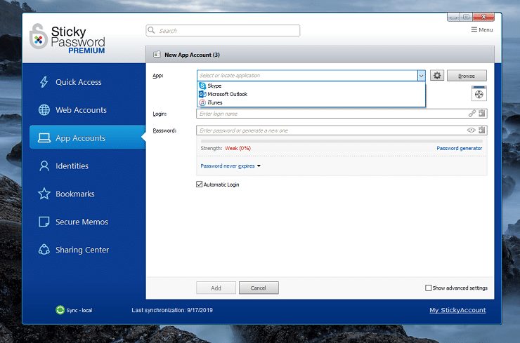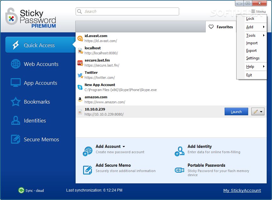 Sticky Password is a professional security tool with rich features for storing passwords to online accounts, applications and identity information in a single place. It facilitates quick access from any location, thanks to Cloud-based technology.